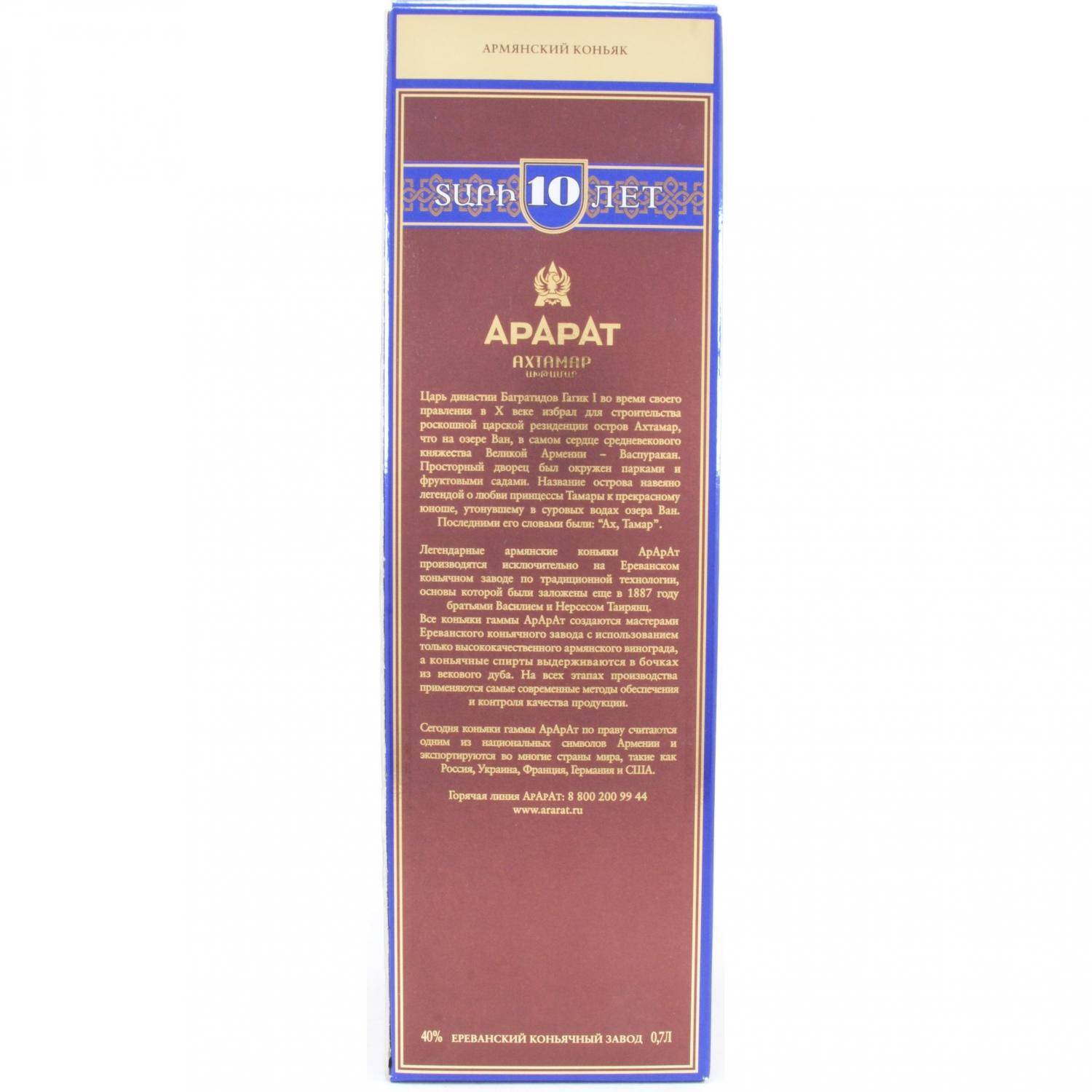 Ararat Akhtamar (40%) — коньяк янтарного цвета с красновато-медным отблеском, создан из спиртов десятилетней выдержки. Аромат лёгкий, гармоничный, с нотами мёда, миндаля, чернослива и ванили. Бархатистый вкус с оттенками чернослива и корицы. Приятное продолжительное послевкусие с терпкими тонами дуба.