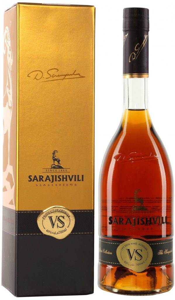 Сараджишвили – это дорогой эталонный коньяк, изготавливаемый в Грузии. Для его производства применяется исключительно белый виноград. Готовится путем прессования ягод, двойной дистилляции и выдержки в дубовых бочках. Учитываются французские и грузинские традиции. Характеризуется янтарными оттенками с золотистыми и медными переливами. Вкусовые качества многослойные и сбалансированные. Идеально сочетается с крепким кофе. Представлен Сараджишвили в таких разновидностях: 3*, 5*, VS, VSOP, ХО. Стоимость начинается от 1400 рублей.