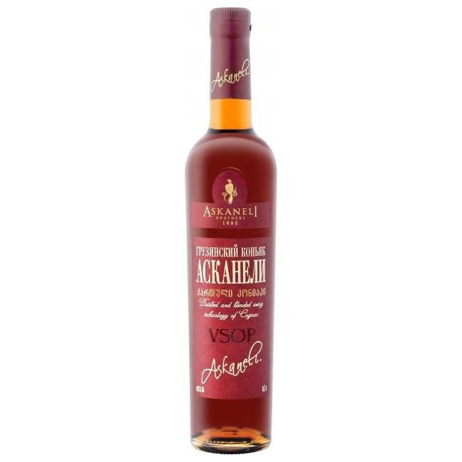 Асканели – известная грузинская коньячная марка. Производится по традиционной рецептуре. Используются лучшие сорта винограда: Чинури, Цицка, Мцване, Цоликаури, Ркацители. Имеет янтарный окрас с различными оттенками (медными, бархатными, золотистыми). Запах насыщенный, содержит нотки ванили, сухофруктов, дуба, винограда. Вкус сдержанный. Имеется обжигающая перчинка. Срок выдержки варьируется от 3 до 8 лет. Отличный подарок для мужчины. Стоимость Асканели составляет около 1100 рублей.
