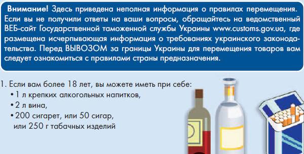 Например, из Украины можно вывезти только по литру крепкого спиртного на одного совершеннолетнего путешественника (хотя, если человек не достиг 21-летнего возраста, то прилетев в США или, скажем, в Великобританию, он таковым считаться уже не будет).
