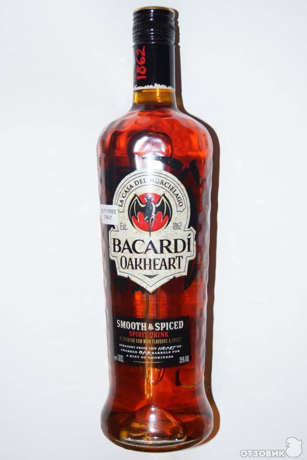 Bacardi OakHeart. Ром Бакарди Оакхарт — ещё один вид тёмного рома. Крепость составляет тридцать пять градусов. Букет невероятно сложен. Присутствуют такие нотки, как дымные, дубовые, черносливовые, изюмные, ванильные, вишнёвые и карамельные ноты, а также цедр апельсина и кураги, с дополнением клинового сиропа. Но, к сожалению, послевкусие недолгое. Его тоже пью чистым, можно добавить лёд.