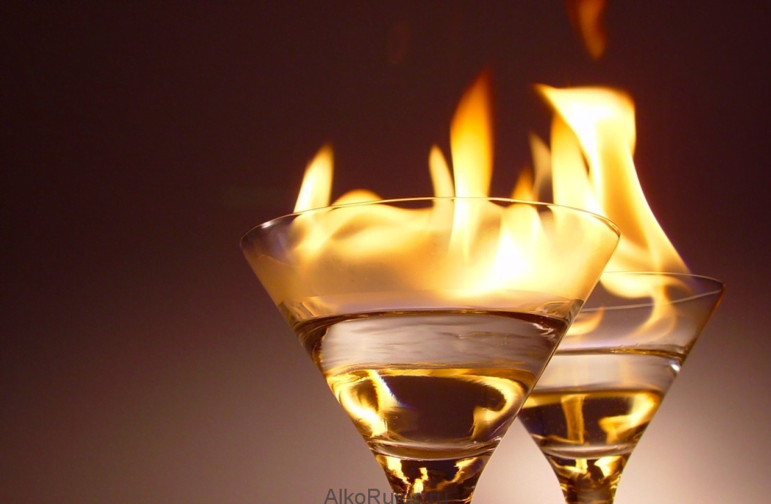 • После этого содержимое в бокале поджигают и пьют с помощью рубочки, одновременно выливая в него содержимое из двух шотов.