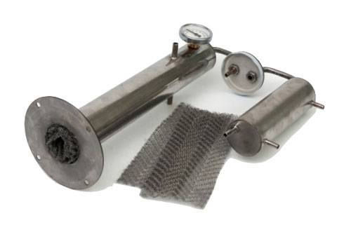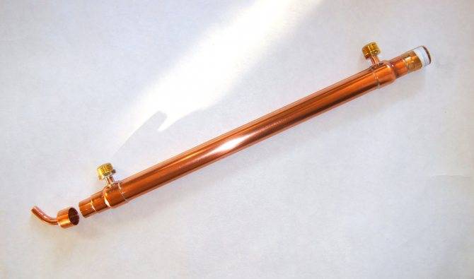 - Труба, желательно чтобы она была сделана из нержавеющей стали, поскольку именно этот материала устойчив к растворителям, спиртам и маслам. Другие металлы могут окисляться в процессе выгона самогона и контакта с различными веществами, чего нельзя сказать о нержавейке. Длинна трубы составляет 35–45 сантиметров, именно она станет основанием для приспособления.