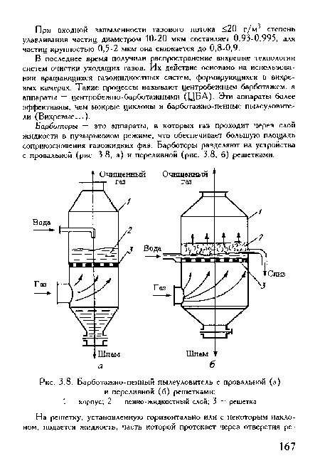 Аппараты барботажного типа представляют собой вертикальные колонны, состоящие из нескольких секций, каждая из которых содержит определенное количество поглощающей жидкости. Отработанный газ подается под давлением и барботирует ( про-булькивает) через слой поглотителя. В момент непосредственного контакта газа и жидкости происходит поглощение вредных примесей. Для увеличения поверхности соприкосновения кромку колпачков каждого барботера изготовляют зубчатой формы. Проходя между зубцами, поток газа разбивается на множество мелких струй, чем и достигается повышение степени поглощения.