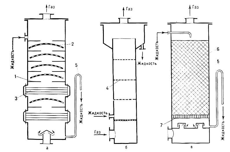 Для абсорбции применяются аппараты барботажного типа, представляющие собой вертикальные колонны, состоящие из нескольких чугунных бочек с фланцами; бочки соединяются на резиновых прокладках и стягиваются болтами.