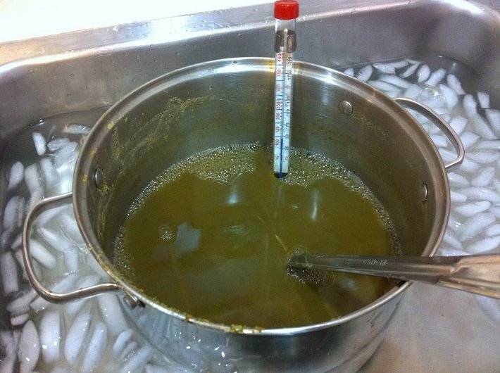 При использовании инвертированного сиропа алкоголь получается мягким, без посторонних привкусов. Но в целом, шаг необязательный, и, если вы решили его пропустить, просто растворите сахар в теплой воде. В емкости для брожения смешать приготовленный сироп (или сахар) и 24 л воды. Оптимальная температура смеси перед внесением дрожжей – 27-30⁰С