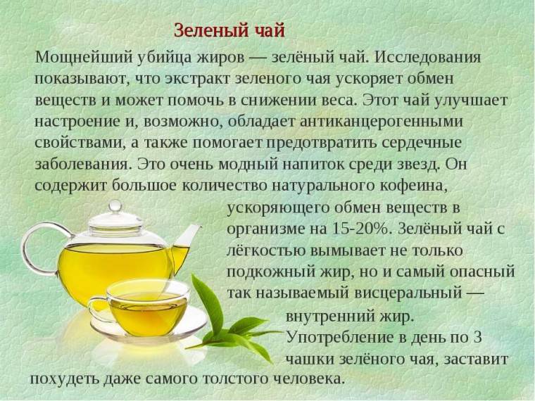 Одно из исследований показало, что люди, употребляющие зеленый чай ежедневно и не меняющие свои гастрономические привычки, за 12 недель потеряли примерно 2 кг лишнего веса. Результаты другого исследования показали, что у любителей чая индекс массы тела более близок к норме.