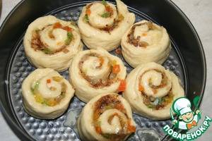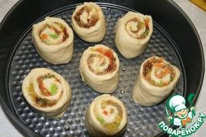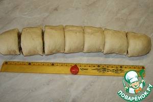 Далее сворачиваем плотно рулет и защипываем края. Нарезаем рулет, у меня получилось 7 булочек, каждая приблизительно по 4 см.