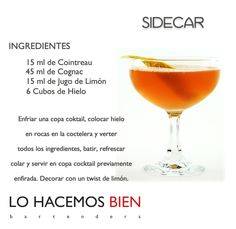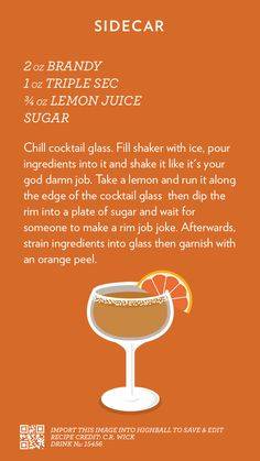Этот коктейль — отличный, известный мне пример, как был испорчен великолепный напиток. Он был открыт моим бывшим другом в баре Парижа во время Первой мировой войны, и был назван в честь мотоциклетной коляски, в которой приезжал и уезжал капитан, пивший в маленьком бистро, где напиток был рожден и где ему было дано имя. В действительности он содержал только шесть или семь ингредиентов вместо трех, как сейчас печатают практически во всех рецептурных книгах.