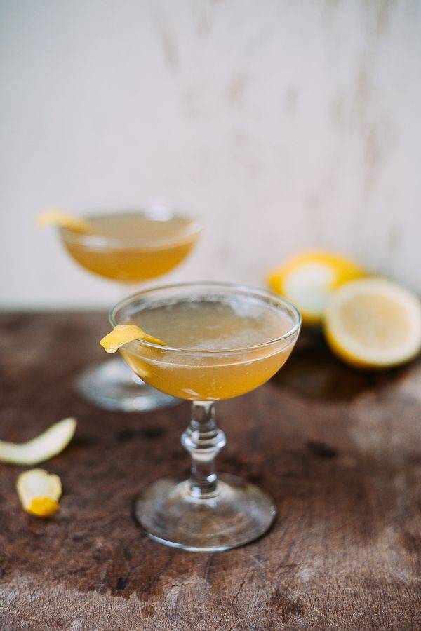 Размешайте все ингредиенты с большим количеством льда и процедите в подготовленный бокал. Для подготовки бокала вырежьте широкую и длинную полоску лимонной кожуры (приблизительно с половины лимона), нанесите на бокал сахарный ободок и оберните каемку бокала кожурой изнутри.