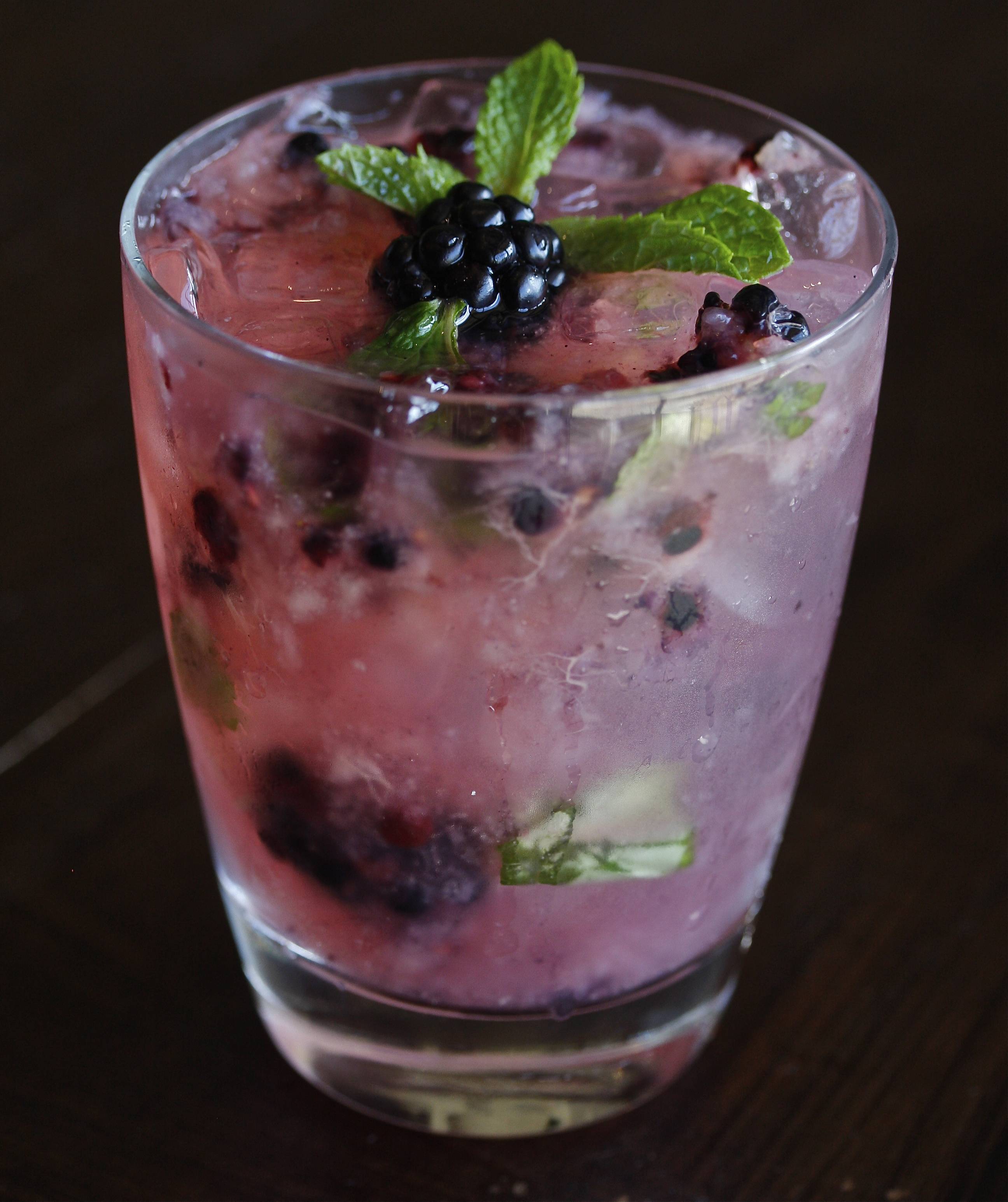 • добавить 30 мл сиропа, столько же гранатового сока, 45 мл рома и содовую до верха бокала, перемешать, положить лед.