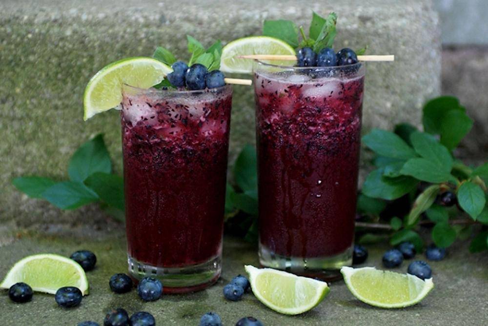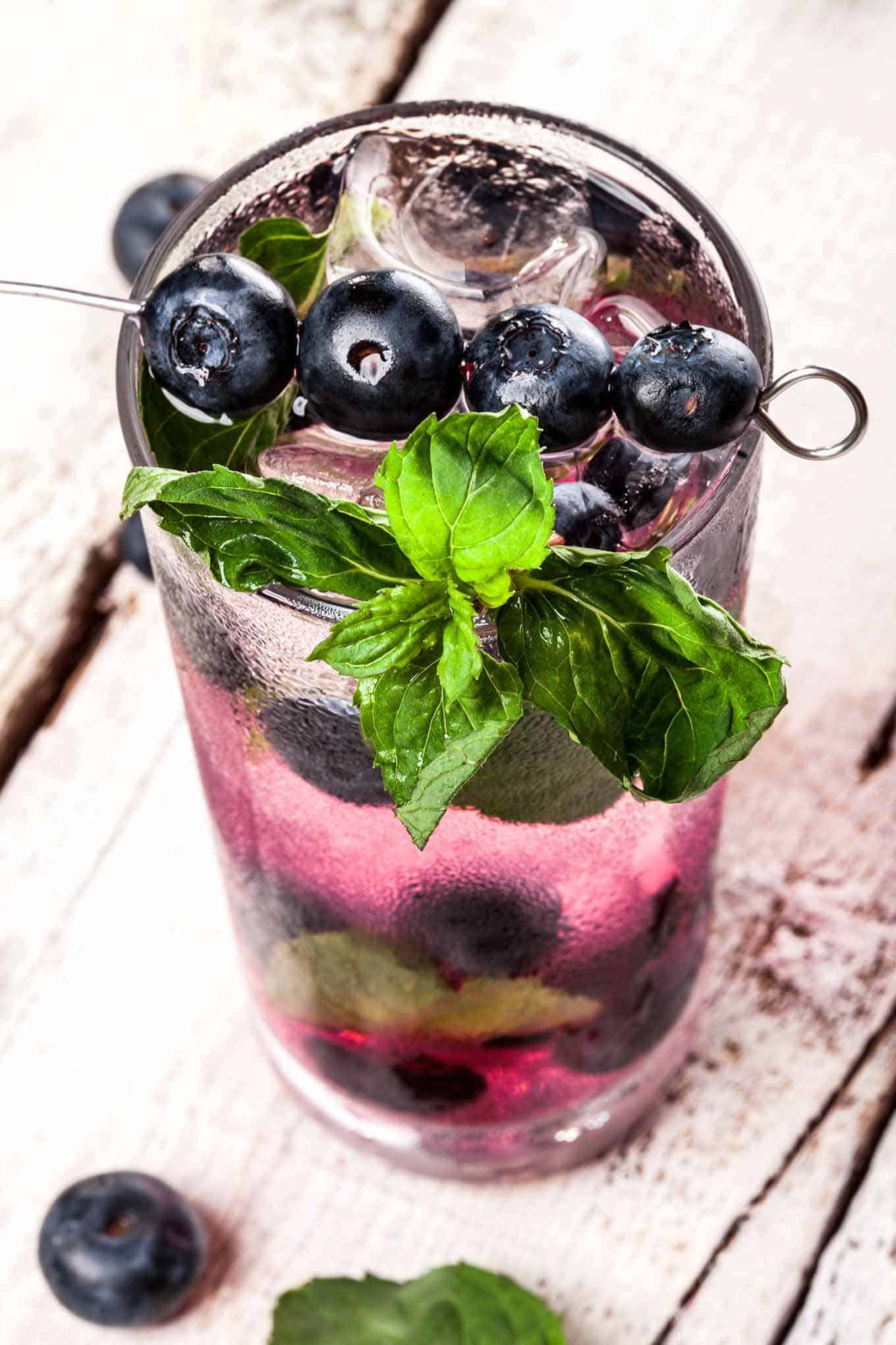 5. Подавать в высоких ровных бокалах, украсив каждую порцию верхушкой веточки мяты и несколькими ягодами черники.
