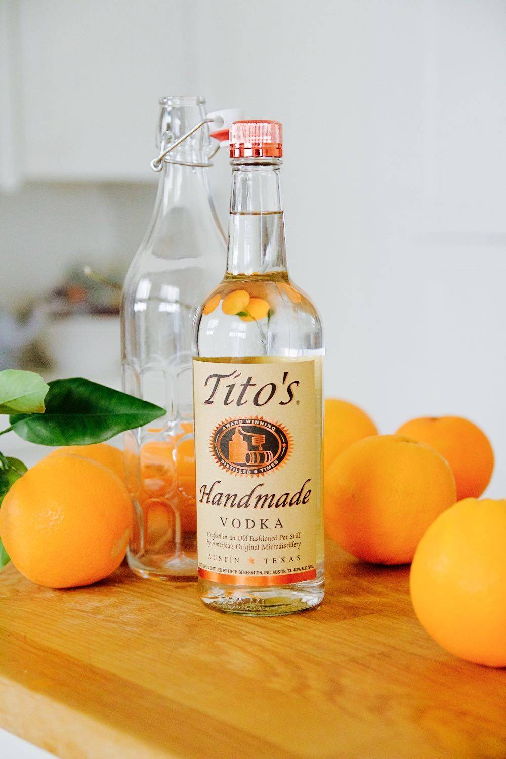 Рецепт из целых плодов. При приготовлении не нужно выдавливать мякоть апельсинов, так как это усложнит фильтрацию. В качестве спиртного подойдет любой крепкий алкоголь – водка, разбавленный спирт, или хороший самогон. Настойку на водке можно использовать как ингредиент для различных коктейлей или употреблять в чистом виде.