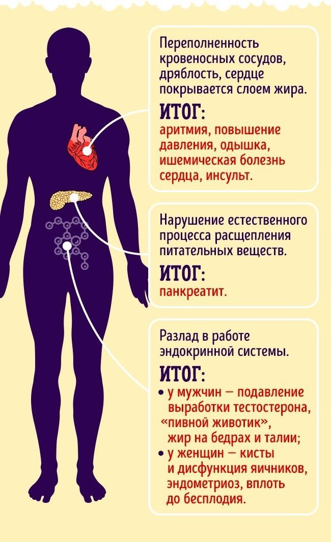 Сердечно-сосудистая система: аритмии и недостаточность сердечной деятельности. Значительно возрастает риск инфарктов и инсультов. Углекислый газ в пиве приводит к расширению сосудов и в дальнейшем – к варикозу.
