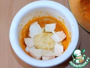 3. К тыкве добавить мягкое масло, сырок и снова пюрировать смесь.