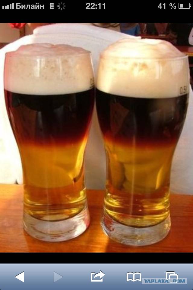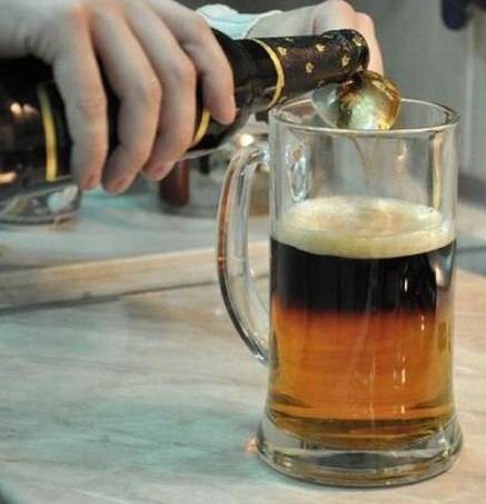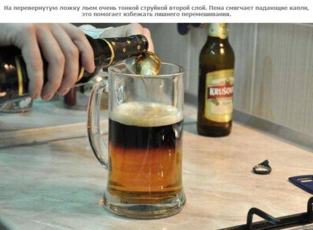 - Далее – на перевернутую ложечку, подставленную посередине бокала вверху, льем второе пиво – тоненькой струйкой. Пена от предыдущего слоя должна смягчать падение струи, предотвращая дополнительно процесс смешивания. Когда второй слой пива выстроился на 3-5 сантиметров, льем уже гораздо смелее и быстрее. А завершать процесс можно даже и без ложки при определенном навыке.