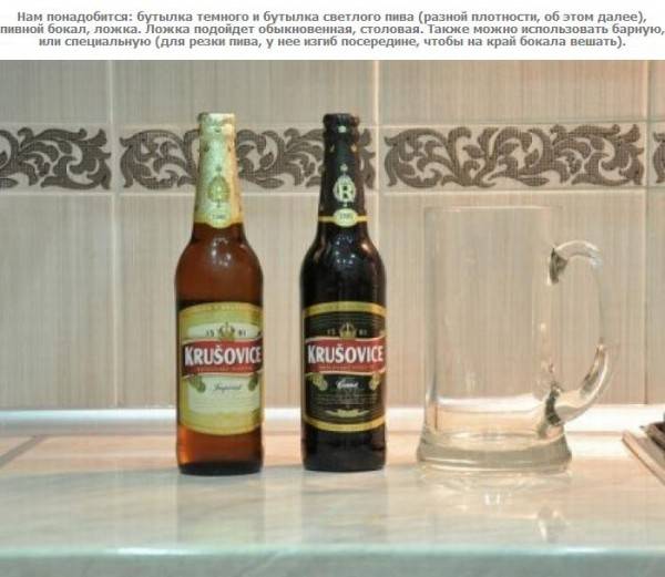 Нам понадобятся пол-литра темного и пол-литра светлого пива, желательно одного и того же производителя (рецептура-то у всех схожая, но могут существовать некоторые нюансы в виде добавок, плохо сочетаемых друг с другом), большой пивной бокал и ложечка (если нет специальной, то можно с успехом использовать обыкновенную столовую). У специальной ложки для резки пива есть посередине изгиб, чтобы было удобно ее вешать на край бокала.
