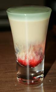 - Pousse Café. В бокал (шот или хайбол) последовательно налить слоями равные порции гренадина, кофейного ликера, мятного ликера, трипл сек, бурбона, рома.