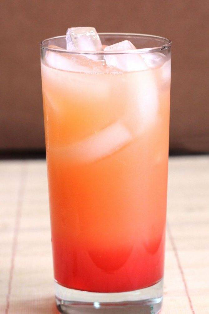 - Tequila Sunrise. Наполнить бокал хайбол льдом. Залить 4 части апельсинового сока, полторы части текилы, добавить несколько капель гренадина. Бокал украсить коктейльной вишенкой и долькой апельсина.