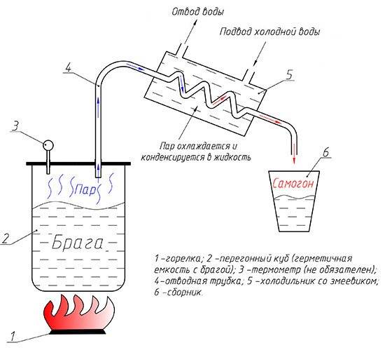 - Перегоняем брагу на спирт-сырец на простом самогонном аппарате.