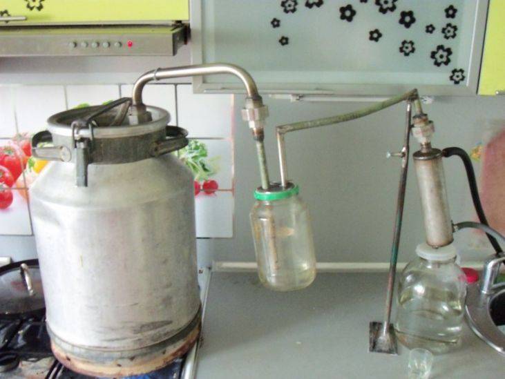Приемную банку установите подальше от газовой конфорки, и подстрахуйтесь от проливания, подставив под нее еще одну емкость. Спирт является легковоспламеняющейся жидкостью, и ошибок не прощает.