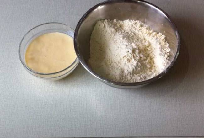 Вы можете заметить, как молочная масса вспенилась. Это значит, что сода «подружилась» с кефиром (сметаной) и все идет по плану.