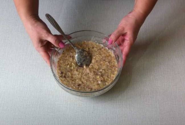 Миксером работать тут не нужно. Достаточно будет обычного ручного венчика. Масса должна получиться светлой, однородной. Вливаем ее к орехам и хорошенько перемешиваем.
