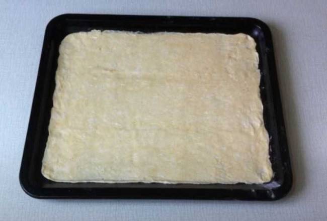 Берем противень. Смазывать его ничем не нужно, так как тесто само по себе достаточно жирное. Кладем на него первый кусочек и раскатываем по ширине формы. В данном случае – 30 х 40 см. Если вдруг тесто прилипает к скалке, припылите его небольшим количеством муки или катайте через пленку.