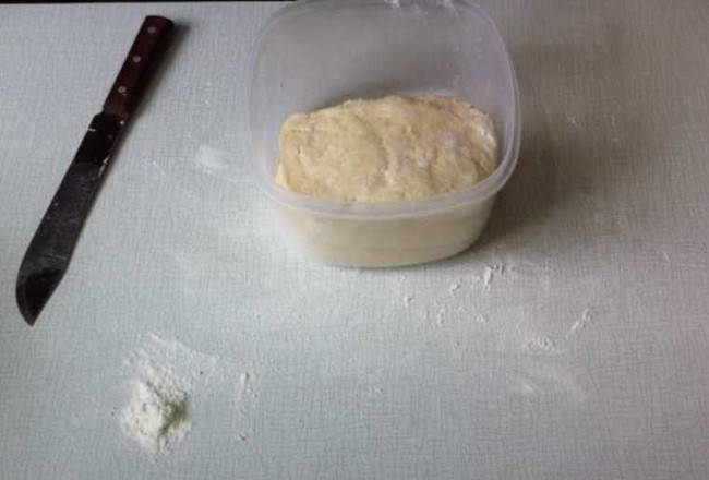 Теперь, чтобы легче было его раскатывать, нужно убрать тесто в холодильник. Для этого берем контейнер или пакет, насыпаем сюда немного муки. Каждую часть формируем лепешкой, припыляем мукой, чтобы они не прилипали друг к другу. Накрываем крышкой или завязываем пакет. Кладем стопкой и убираем в холодильник на полчаса.