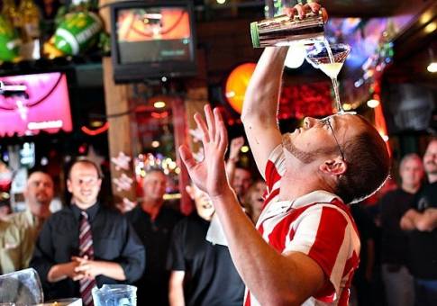 Особым искусством среди барменов считается умение использовать тесное пространство себе на пользу, поражая всех мастерством бросков и жонглированием предметами в окружении бокалов и бутылок — хрупких стеклянных предметов.