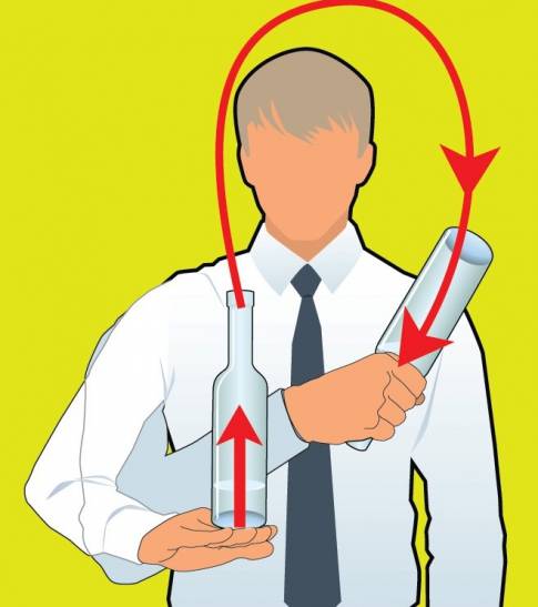 Подбросьте инвентарь так, чтобы он приземлился донышком прямо вам на тыльную сторону ладони. При этом нужно учитывать, что шейкер и бутылка весят неодинаково — поэтому и подбрасывать их нужно с разной силой.