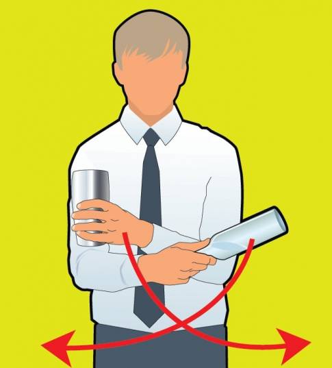 Возьмите бутылку за горлышко в одну руку, а шейкер — в другую. Скрестите руки. Придайте локтевыми суставами небольшую инерцию и разведите руки в стороны.