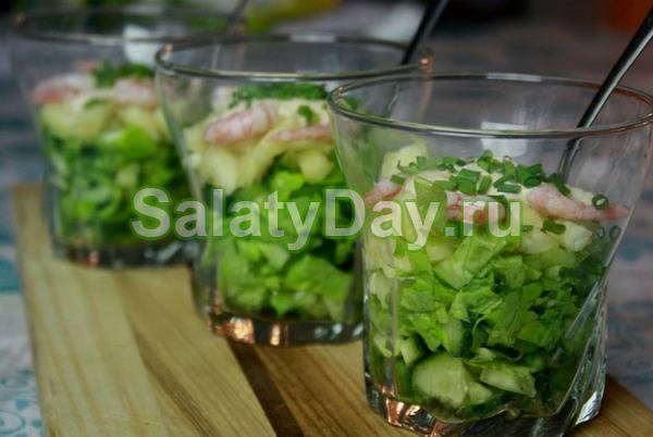 Выложить крем с укропом на дно бокала. Затем, выложить салат. Украсить карамелизированными креветками.