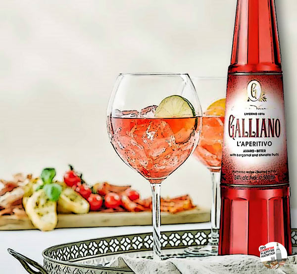 • L’Aperitivo. Горьковато-цитрусовый ликер крепостью 24%. В состав напитка входит бергамот, померанцы, кинотто, мандарины, грейпфруты – не считая трав оригинального Гальяно. Все ингредиенты мацерируют в спирте как минимум две недели.