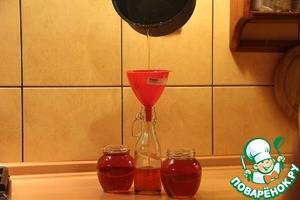 Когда смесь остынет до комнатной температуры, в нее вливают дистиллят, перемешивают и отправляют настаиваться в течение 1-2 недель. Готовую наливку процеживают через несколько слоев марли и разливают по бутылкам.