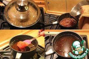 1. В кастрюле средних размеров распускаем 200 г сахара и 50 г воды на среднем огне. Варим, пока сахар карамелизуется и жидкая масса обретёт тёмно-золотистый цвет (только не припaлить — будет горчить), снять с огня.