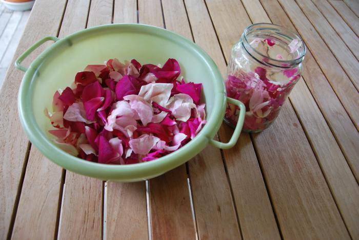 Прежде всего, нам необходимо собрать цветки. Делать это рекомендуется в утреннее время, когда они наполнены ароматом, влагой и свежестью. Обрываем лепестки чайной розы в глубокую эмалированную миску. Кипятим полтора литра воды. Затем заливаем приготовленные лепестки. Добавляем полторы чайные ложки лимонной кислоты и перемешиваем. После того как данная масса остынет, накрываем посуду крышкой и отправляем в холодильник. Здесь наш будущий ликер из чайной розы должен настаиваться в течение двух суток. При этом не реже четырех раз в день массу необходимо помешивать с помощью деревянной ложки или лопатки. Это делается для того, чтобы лепестки розы лучше отдавали жидкости цвет, вкус и аромат.