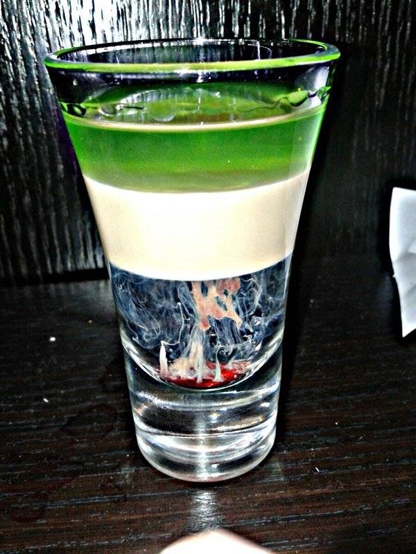 Должна получиться удивительная и яркая картинка. Три слоя с очень четкими границами: прозрачная самбука, над ней густой, цвета молочного шоколада Бейлис, а венчает это все неестественно зеленый абсент. Но пока это еще не Хиросима.