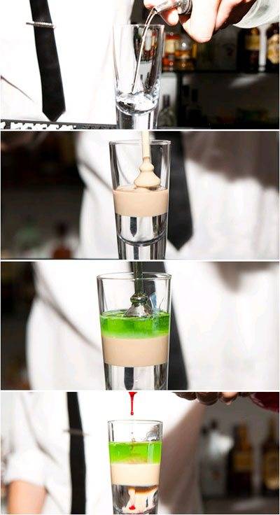 Их немного – всего три, и мы предлагаем вам научиться самим готовить этот вкусный и необычный коктейль. Для этого вам нужно будет освоить технику выкладывания слоев из различного алкоголя.