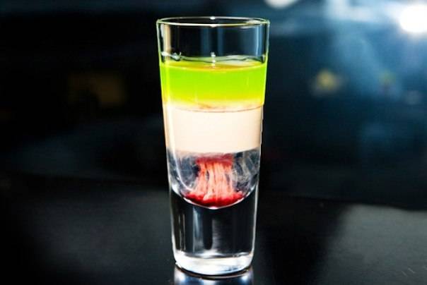 Затем нужно влить 15 мл. гранатового сиропа «Гренадин», который, опускаясь через сливочный «Baileys», и даст тот «ужасающий» эффект мозгов;