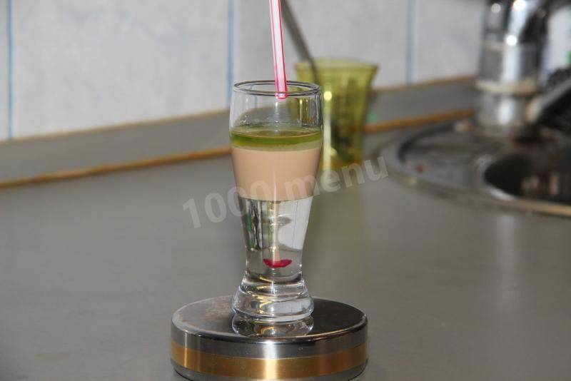 Чтобы получился ровный слой, можно выливать напиток тонкой струйкой через «Чупа-чупс» (конфету нужно держать немного в уже налитом первом ингредиенте);
