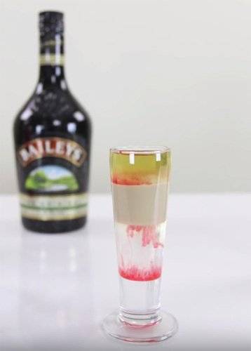 В шот (небольшую рюмку до 60-70 мл. ) нужно слоями аккуратно добавить необходимые ингредиенты. Сначала мы наливаем 15 мл. гранатового сиропа «Гренадин», затем вливаем 10-15 мл. водки (выбирайте напиток только самого высокого качества). Теперь нужно добавить сливочный ликер «Baileys» (10 мл. ). Делать это можно разными способами. Например, вы можете воспользоваться коктейльной трубочкой. Опустите ее одним концом в емкость с ликером, а потом зажмите верхний конец. Быстро разжимайте и зажимайте кончик, чтобы в рюмку с коктейлем падали белые капли. Можно вливать его и прямо из бутылки тонкой прерывистой струйкой. Теперь, используя барную ложку (или аккуратно вливая по лезвию ножа), добавьте 10-15 мл. «Блю Курасао». Завершите процесс приготовления, сделав последний слой из сливок.