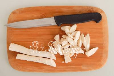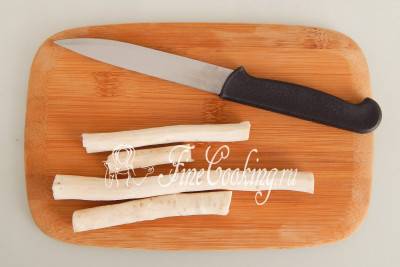Корень хрена очищаем и режем соломкой 3-5 мм толщиной.