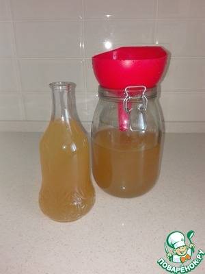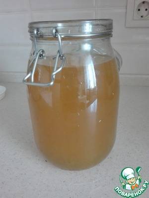 Через 4 суток (максимум — 5, НЕ БОЛЬШЕ!!!), сливаем получившуюся мутноватую жидкость жёлтого или соломенного (зависит от мёда) цвета в подходящую ёмкость. Примерный объём — 1,2-1,3 л.