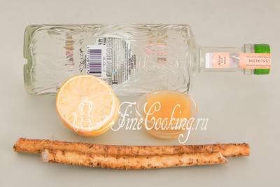 Для приготовления домашней хреновухи по этому простому рецепту нам понадобятся следующие ингредиенты: водка, корень хрена, натуральный мед и лимонный сок.