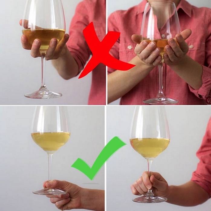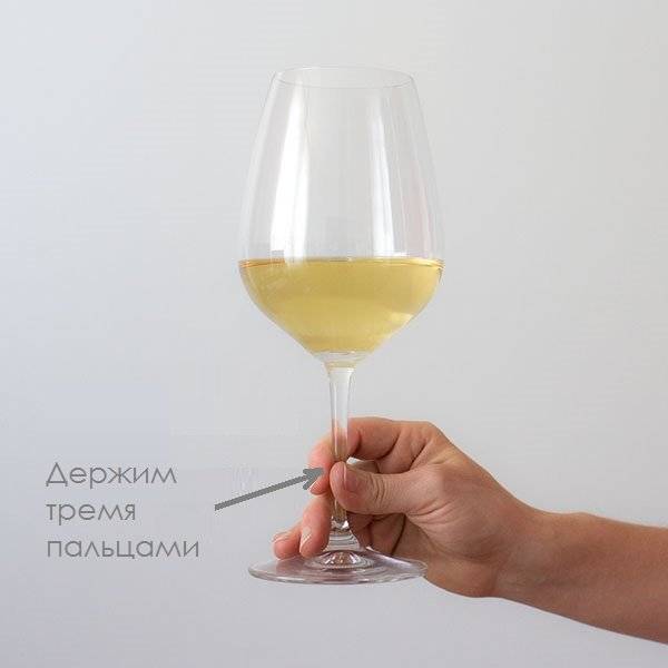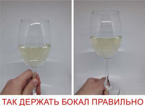 - Держать ножку между большим и основанием указательного пальца с одной стороны, и придерживать кончиком указательного с другой. Три остальных пальца направленны вдоль нижней части бокала, слегка касаясь основания. Выглядит немного вычурно, указательный палец как бы обвивает фужер. Вдобавок, такой способ не самый удобный.