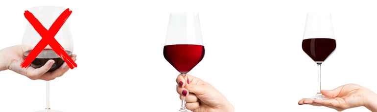 С красным вином все несколько по-другому. Бокалы, предназначенные для этого напитка, имеют больший размер, чем те, которые применяют для белых вин. Их наполняют на одну треть. В бокалы чуть меньшего размера можно наливать на половину. И поэтому особых оговорок как держать бокал с красным вином не имеется.