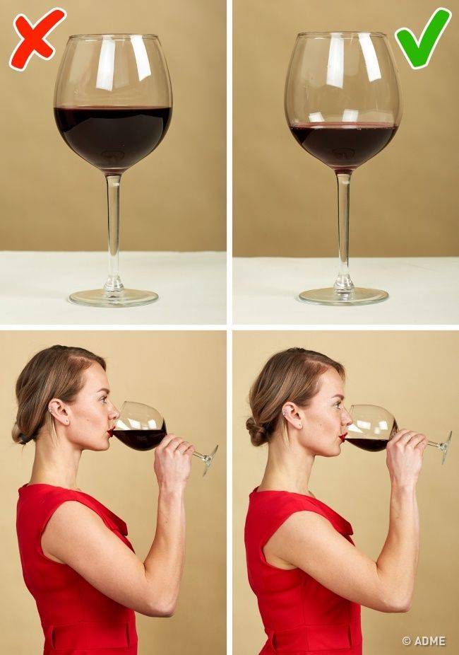 - Бокал должен быть заполнен только на 1/3, если это красное вино, и на половину в случае белого. Бокал с шампанским наполняется на три четверти. Наливать доверху крайне не практично, бокал будет опасно балансировать между тремя пальцами и рано или поздно прольется, испортив скатерти и репутацию.