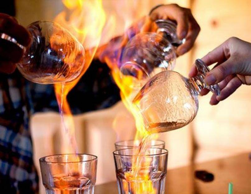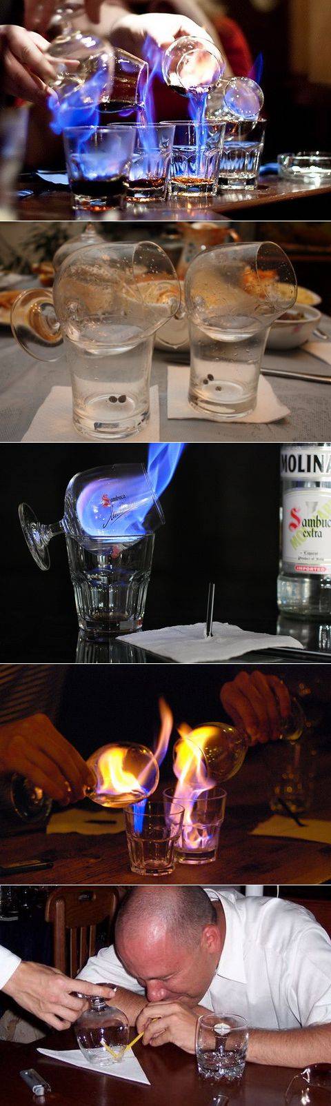 Горящая рюмка с самбукой. С непривычки может показаться страшновато, но зато необычно. Ценители уверяют, что вкус горячей самбуки великолепен и неповторим. Ощущения дегустатора исполнены новизны. Как сделать «огненный коктейль»? Берем 2 бокала. В один бросаем 3 кофейных зерна, наливаем ликер, поджигаем. Синеватое пламя держится секунды. Когда оно гаснет, переливаем ликер в рокс (широкий бокал), залпом выпиваем. Второй бокал быстро накрываем заранее подготовленной салфеткой, в которой проделана дырочка и вставлена трубка. В бокале собираются пары аниса. Их нужно вдохнуть, а потом разжевать кофейные зерна.
