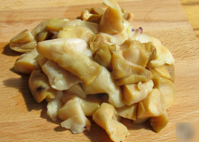 Мясо моллюска нарезаем кусочками.